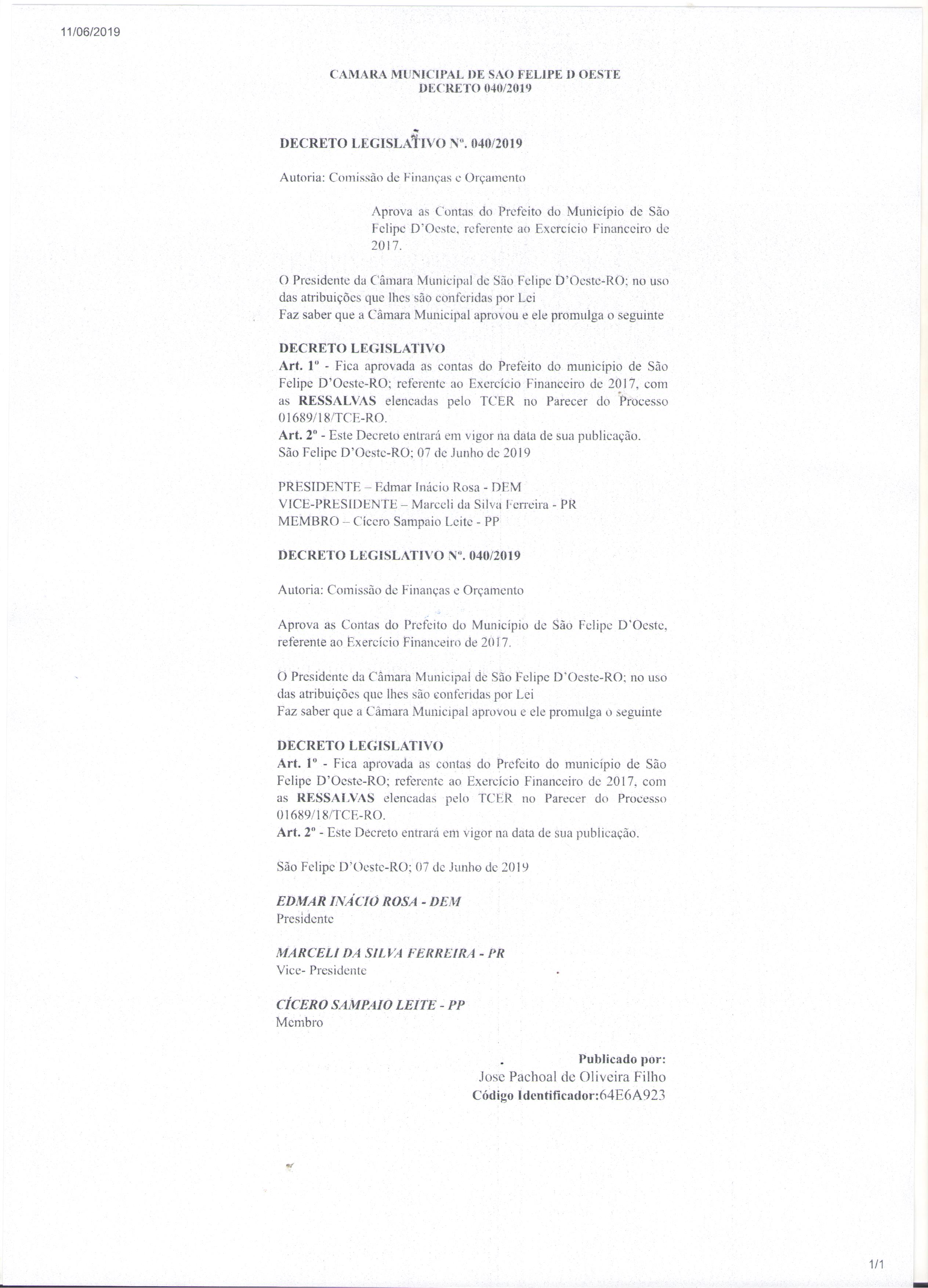 Aprova as Contas do Prefeito do Município de São Felipe D’Oeste, referente ao Exercício Financeiro de 2017.